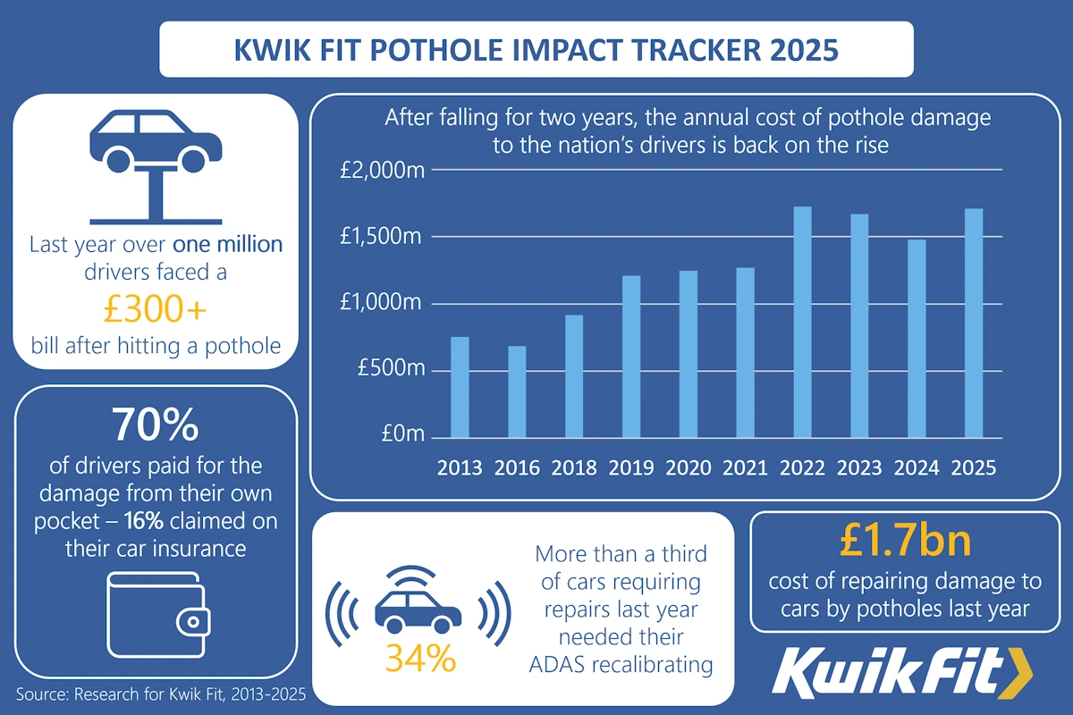- New data reveals worrying news for drivers as the cost of pothole damage increase