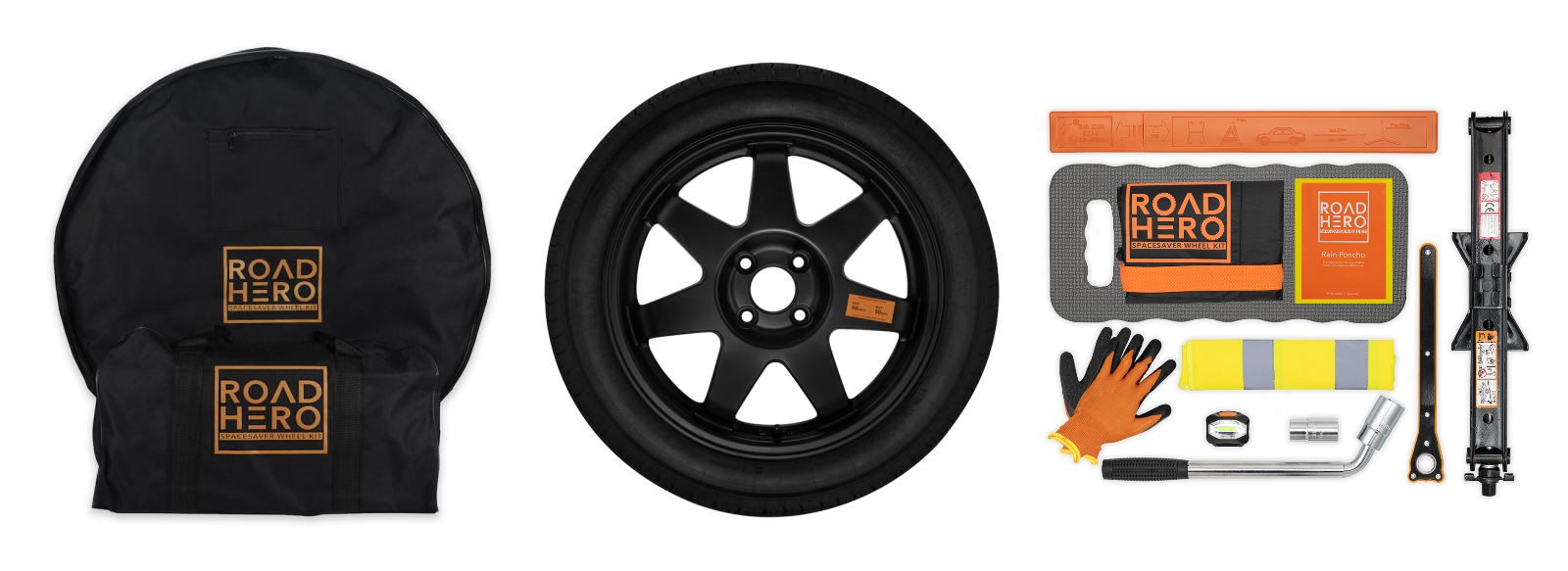 The Road Hero Kit includes a spare space saver wheel with a tyre pre-fitted to the rim. The wheel and fittings are provided in a protective storage bag, along with a breakdown kit, including all of the tools you will need to safely change your wheel. Please note that wheel well fitment is not guaranteed. The breakdown kit includes the following: